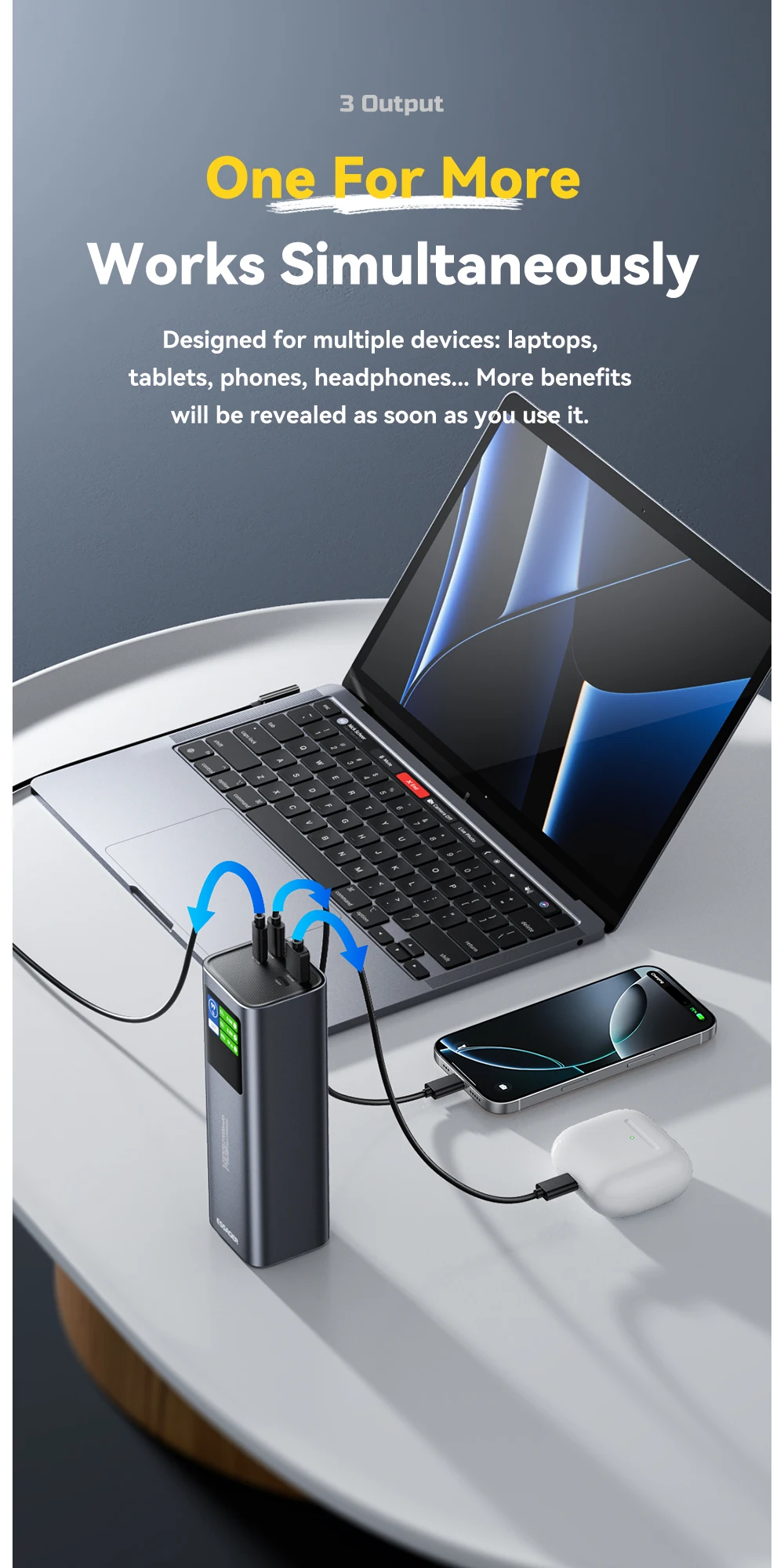 • TRIPLE PORT OUTPUT Features a smart power distribution system with two USB-C ports and one USB-A port, allowing you to fast-charge your laptop, tablet, and phone simultaneously without overheating.