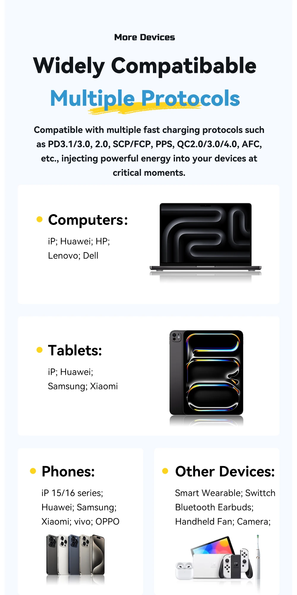 Yes, it supports simultaneous charging via 2 USB-C ports and 1 USB-A port, intelligently distributing power to each device.