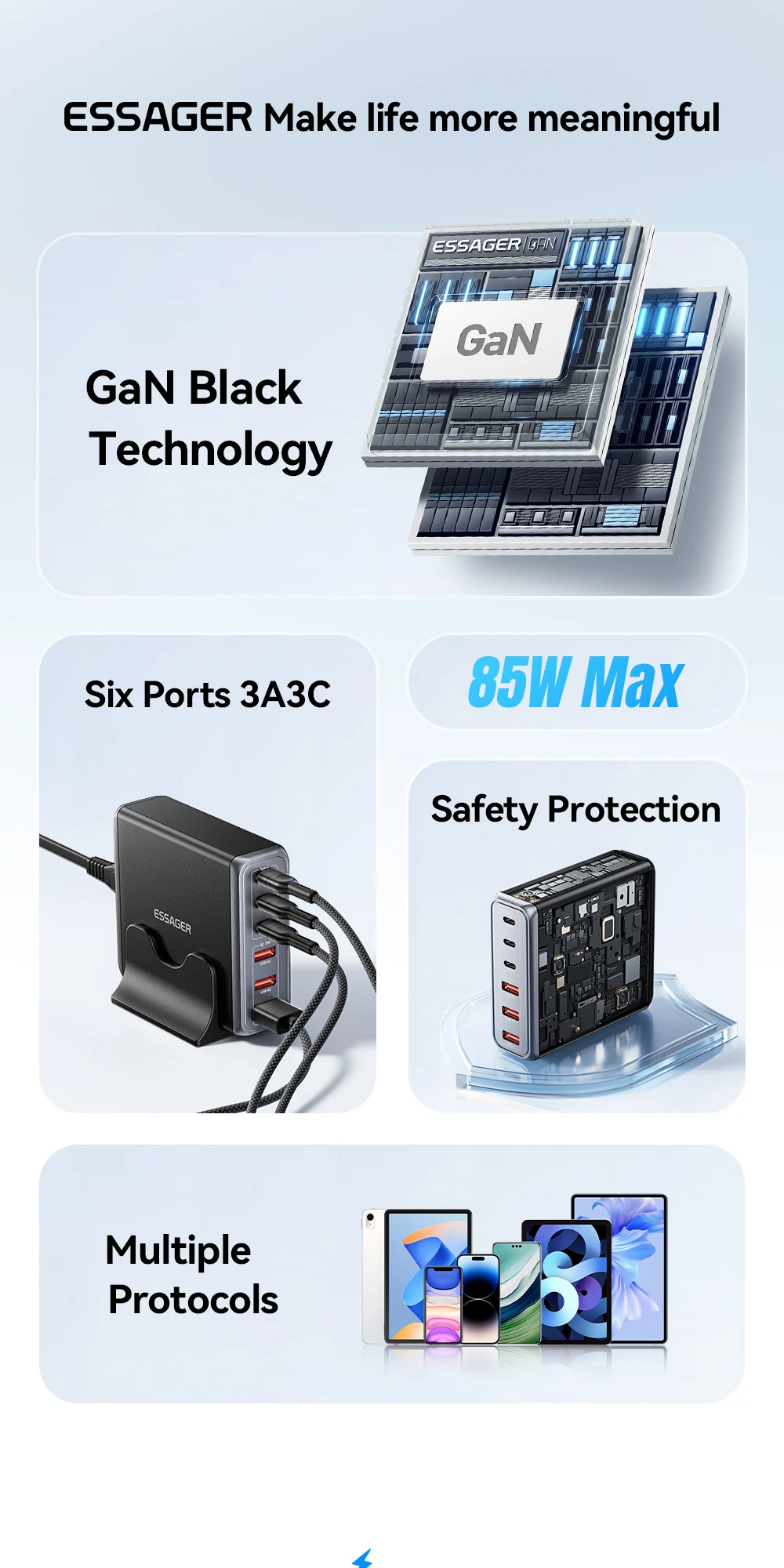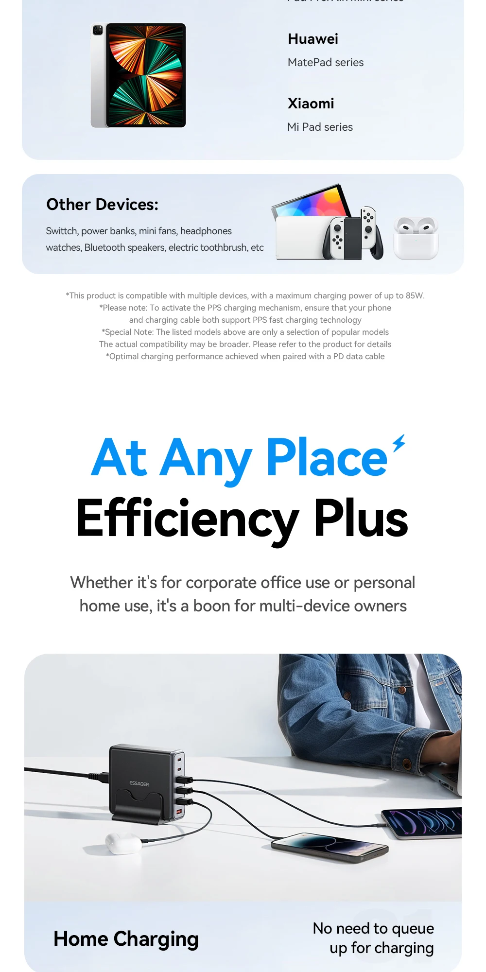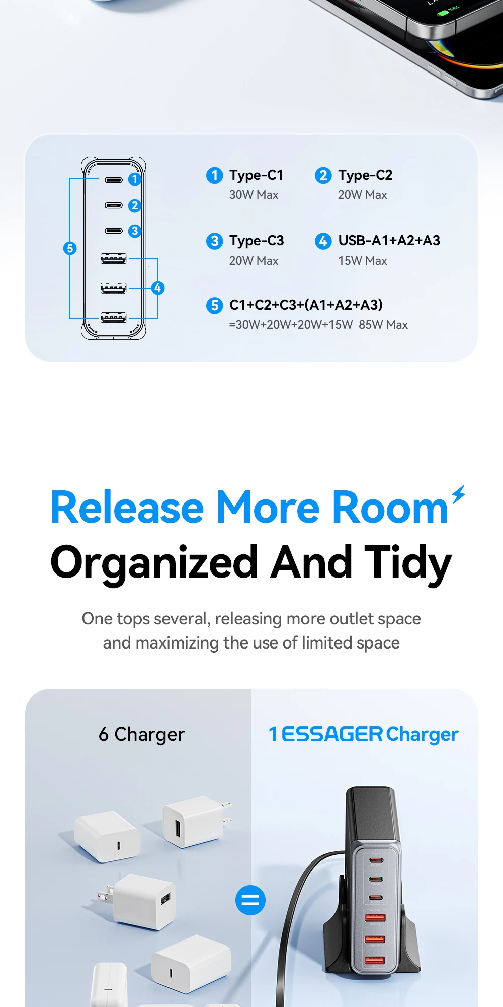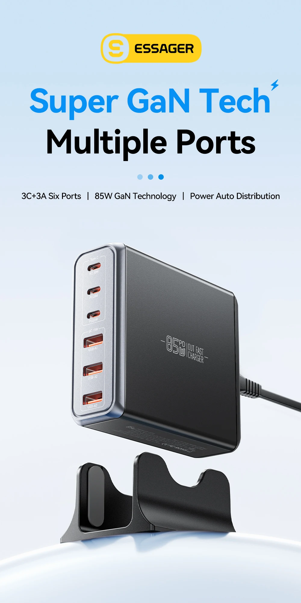 One Charger for Every Device Why carry five chargers when one does it all? With a massive 85W output and six versatile ports (3 USB-C and 3 USB-A), this station intelligently distributes power to laptops, smartphones, tablets, and accessories simultaneously. Whether you are powering a workstation or charging family devices, it handles the load with efficiency and speed.